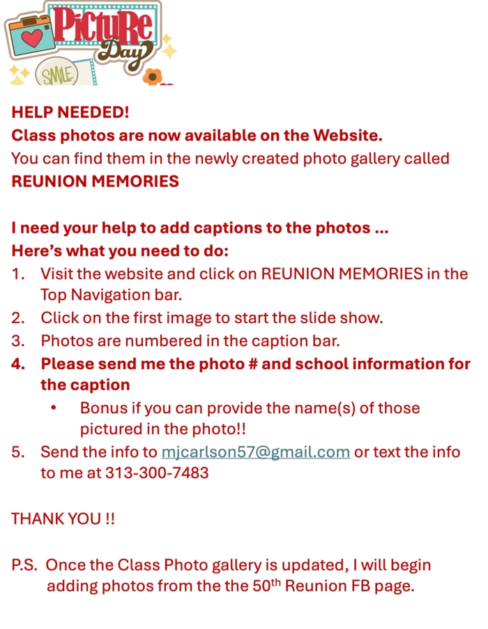The primary purpose of this website is to bring classmates together to celebrate our 50th High School Reunion in 2025.